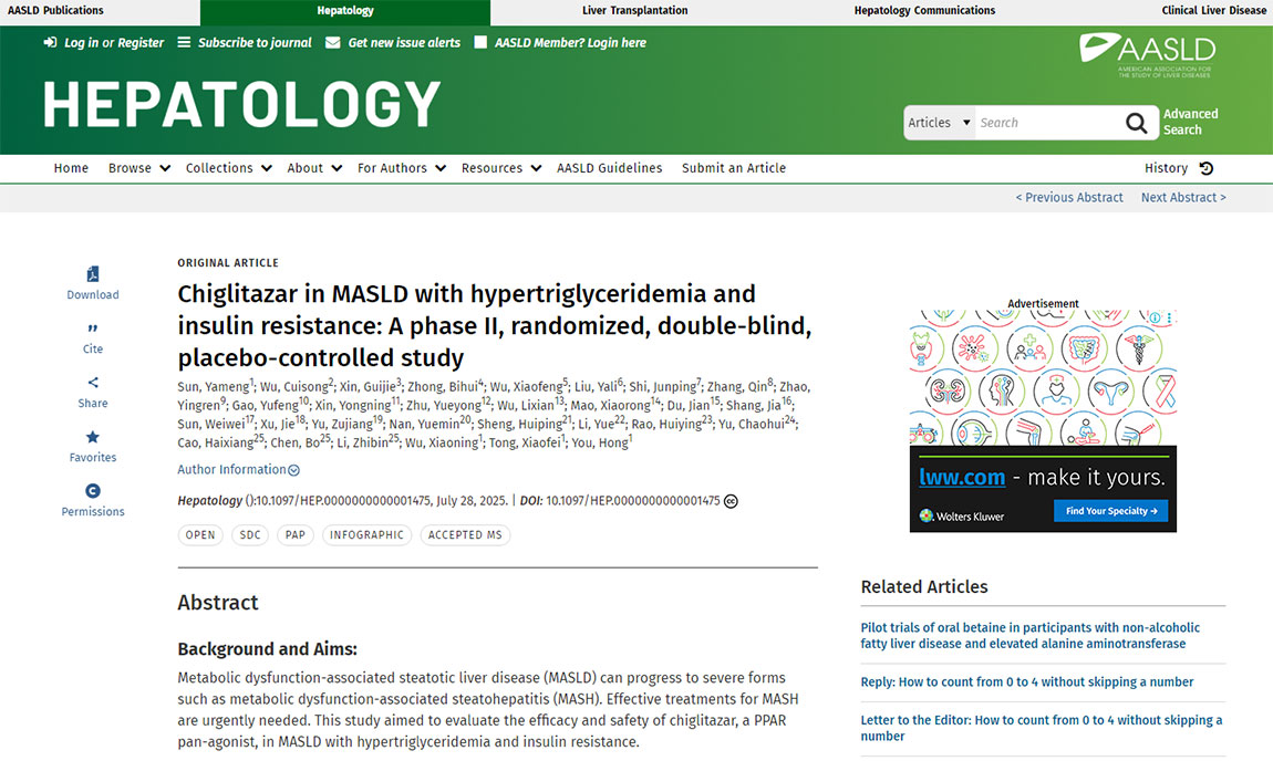 International Hepatology Journal Publishes Key Study on Chiglitazar Sodium (Bilessglu®) for MASH Treatment