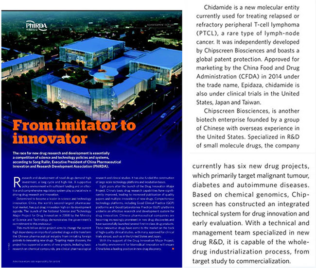 文中介绍了西达本胺和西达本胺的研发团队。西达本胺是微芯生物自主研发的具有全球专利保护的全新分子体,用于治疗复发及难治性外周 T 细胞淋巴瘤(PTCL),2014 年底获国家食品药品监督管理局(CFDA)批准上市,同时,其美国、日本、中国台湾等地的临床试验也在进行中。微芯生物由留美归国团队创立,以自主构建的基于化学基因组学的集成式药物发现与早期评价体系,专长于小分子药物研发,通过建立一支专长于新化学结构创新药物研发及管理团队,已具备了完整的从药物作用靶点研究到临床候选药物开发及产业化能力。