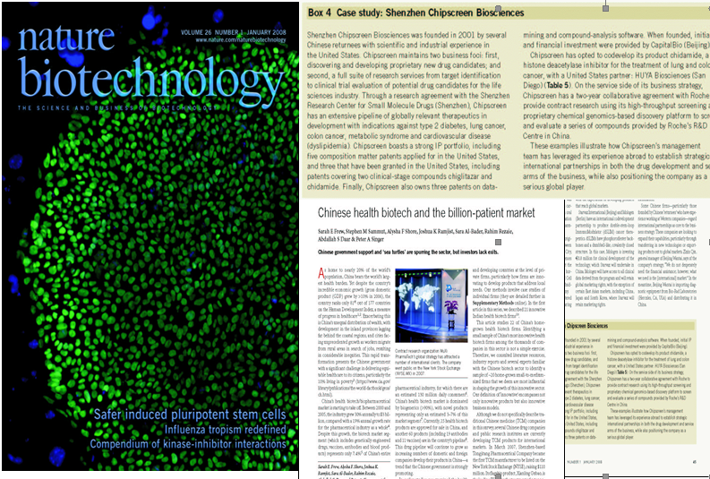 NatureBio technology 2008(1)1:26, 39-53页文章“中国健康生物科技与十亿患者市场”,将中国巨大的患者市场与刚刚腾起的健康生物科技/生物制药产业进行了深入的解析,指出政策的扶持与从海外归国的创业者是激励的一方面,但同时投资者们缺乏出路也是制约产业化发展的瓶颈。文章将庄闲ag生物列为第四个研究案例,纵观了微芯生物的商业发展战略和最新的重大进展,指出微芯生物是创新药物发现与开发领域中值得重视的全球竞技者。 详情请点击原文
